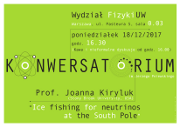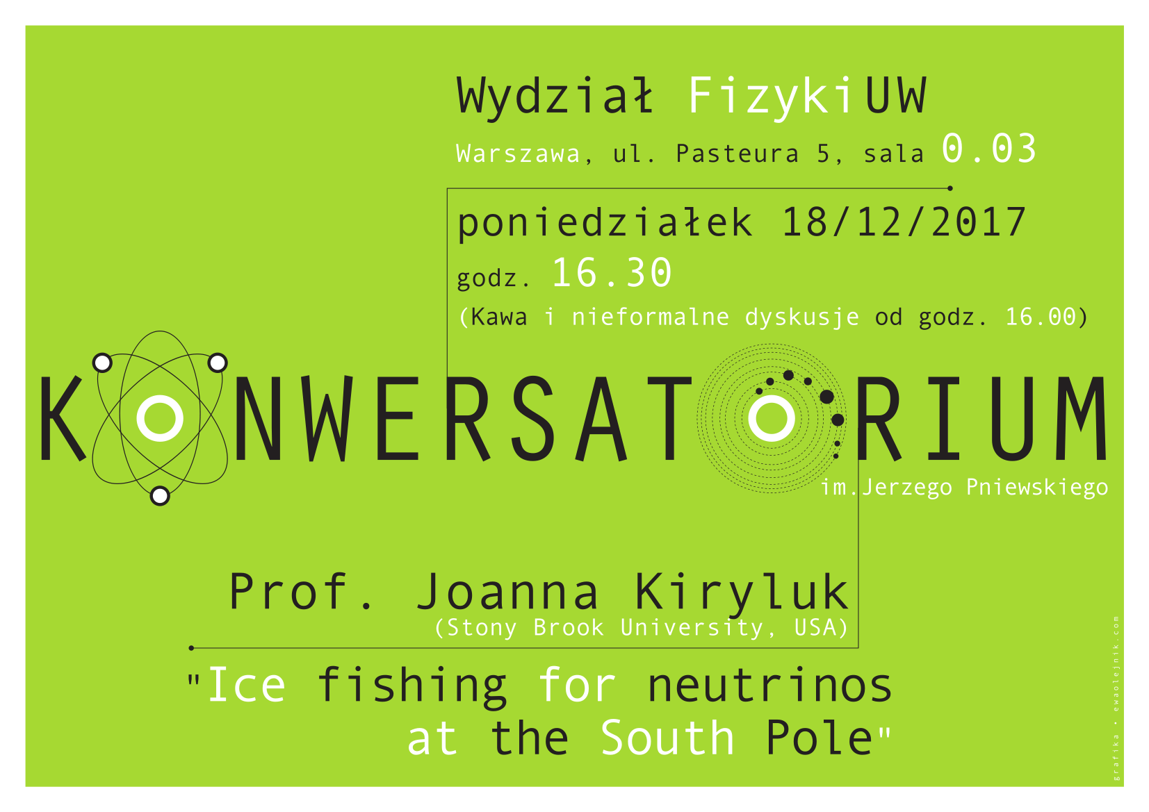Na najbliższym Konwersatorium im. Jerzego Pniewskiego (18 grudnia o godz. 16:30 w sali 0.03) gościć będziemy prof. Joannę Kiryluk z Uniwersytetu w Stony Brook (USA), która wygłosi wykład pt. Ice fishing for neutrinos at the South Pole. Prof. Kiryluk opowie o detektorze neutrin "IceCube", znajdującym się na terenie Amundsen-Scott South Pole Station na Antarktydzie i o badaniach prowadzonych z jego wykorzystaniem. Wykład zilustrowany będzie wspaniałymi zdjęciami z bieguna południowego, wykonanymi podczas budowy "IceCube".