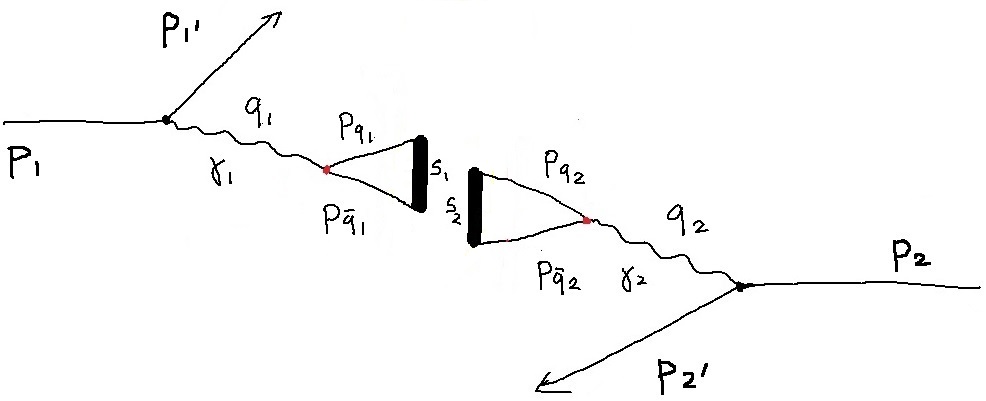 Fizycy z uniwersytetów Case Western, Stanforda, Stony Brook i UW zaproponowali model teoretyczny, który sugeruje możliwość doświadczalnego sprawdzenia, czy we wnętrzu fotonu znajdują się liniowe struktury w postaci struny gluonów łączących kwark z antykwarkiem [1]. Źródłami fotonów mogą być dowolne, wysokoenergetyczne cząstki naładowane, np. protony w LHC, schematycznie przedstawione na rysunku obok. Emitując foton, proton skręca do detektora. Foton zawiera w sobie parę kwark-antykwark, a między kwarkiem i antykwarkiem rozciąga się struna złożona z gluonów, podobnie jak łańcuch składa się z ogniw. Okazuje się, że orientacja struny w fotonie jest skorelowana z kierunkiem, w jakim porusza się proton po emisji fotonu. Kiedy dwa protony lecą naprzeciw siebie jak w LHC i oba emitują fotony gdy skręcają, to struny gluonów z tych fotonów mogą się zderzać jak "gorące parówki". Zderzenie takich parówek widziane wzdłuż wiązki wygląda mniej więcej jak na rysunku poniżej.