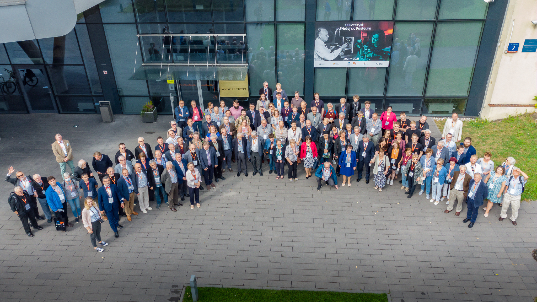 Przy okazji uroczystego podlania miłorzębu, zasadzonego przed wejściem do siedziby Wydziału od strony Banacha dla uczczenia 100-lecia, uczestnicy zrobili sobie z pomocą drona pamiątkowe zdjęcie.