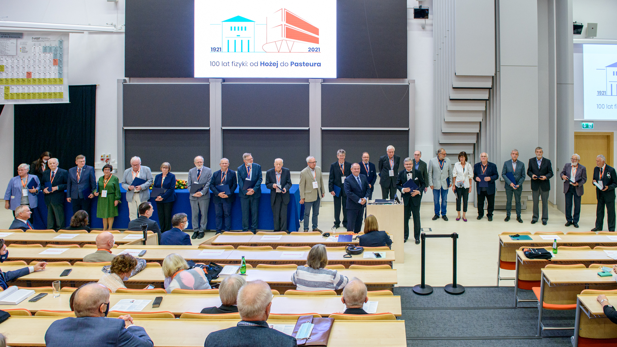 Podczas kilkuczęściowej sesji naukowej uczestnicy zapoznali się z dokonaniami fizyków z Hożej i Pasteura z ostatnich 100 lat w różnych obszarach fizyki. Prelegenci opowiadali też o swoich związkach z Wydziałem i współpracy naukowej.