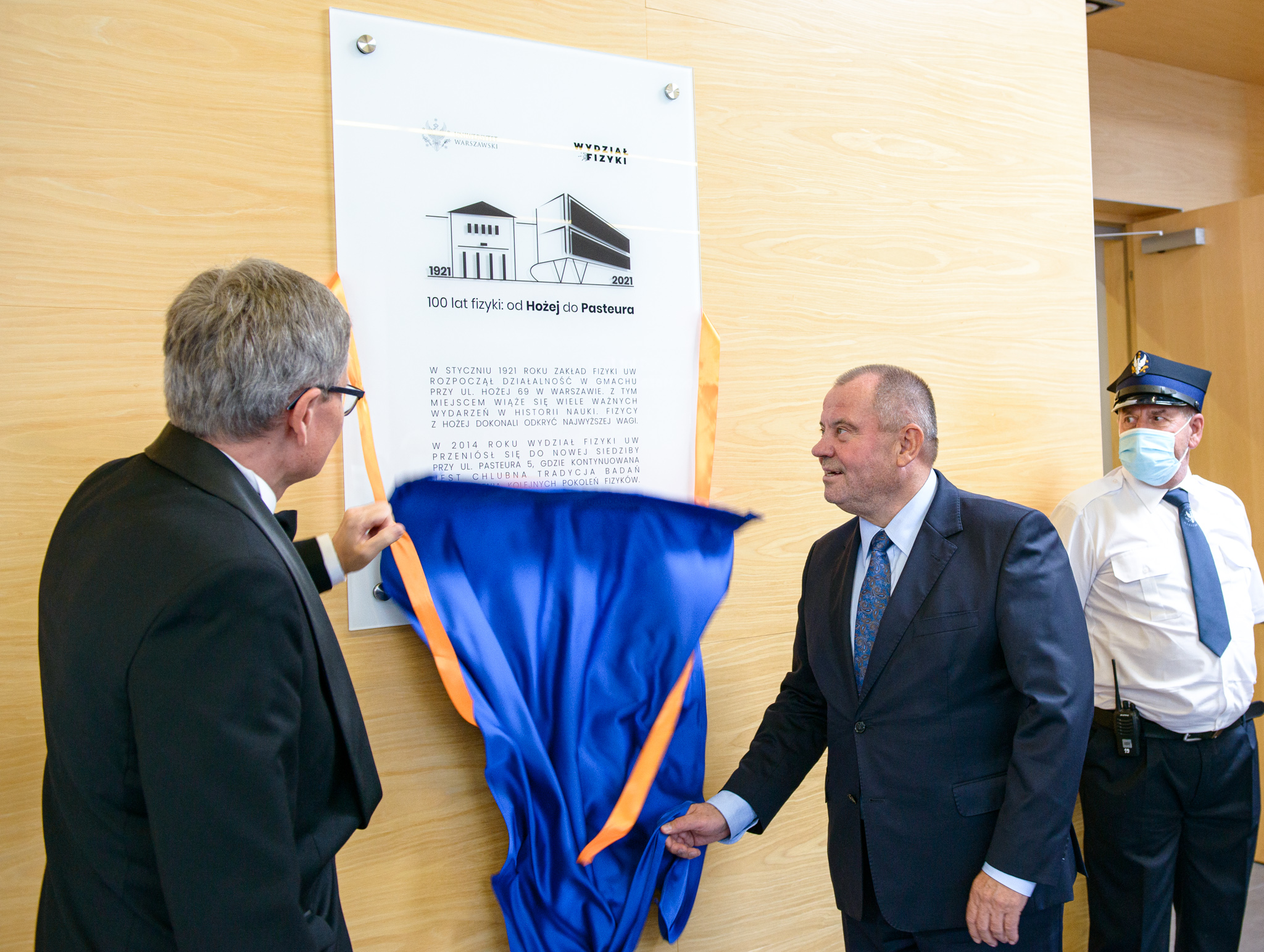 W trakcie obchodów rektor wraz z dziekanem odsłonili tablicę pamiątkową i otworzyli wystawę rocznicową. Zaprezentowane też zostało nowo utworzone Wirtualne Muzeum Wydziału Fizyki UW – FIZYKOTEKA. Goście oglądali pierwsze wprowadzone kolekcje, w tym zbiory zdjęć kilku roczników absolwentów, którzy skończyli studia na naszym Wydziale kilkadziesiąt lat temu, a teraz przybyli na naszą uroczystość. Goście obiecali uzupełnić kolekcje materiałami z domowych archiwów – trzymamy ich za słowo…